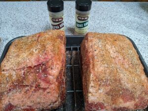 This is a Texas style Ribeye Roast smoked over Oak and Hickory wood. The seasoning blend is a salt & pepper rub plus some of our Home Run Rub.